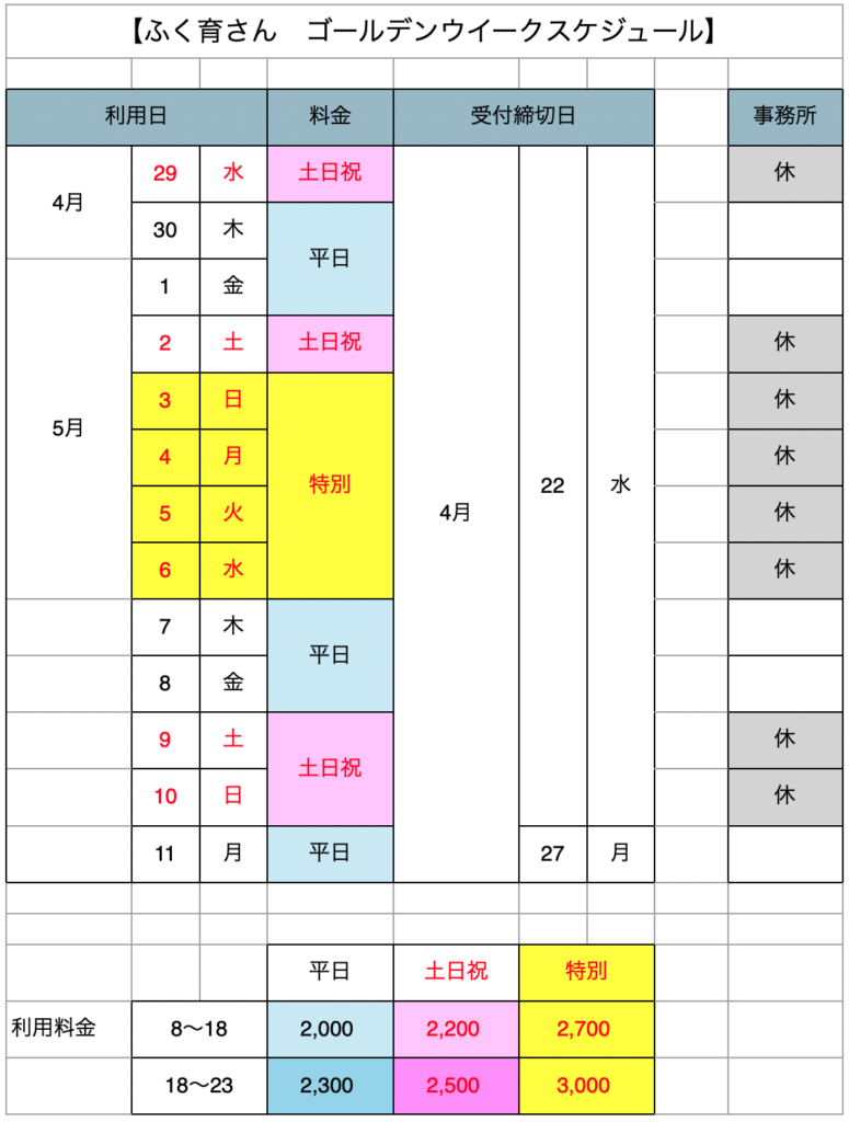 ふく育さんのご利用はゴールデンウイーク期間も無休ですが、申込日は下記の通りとなります。